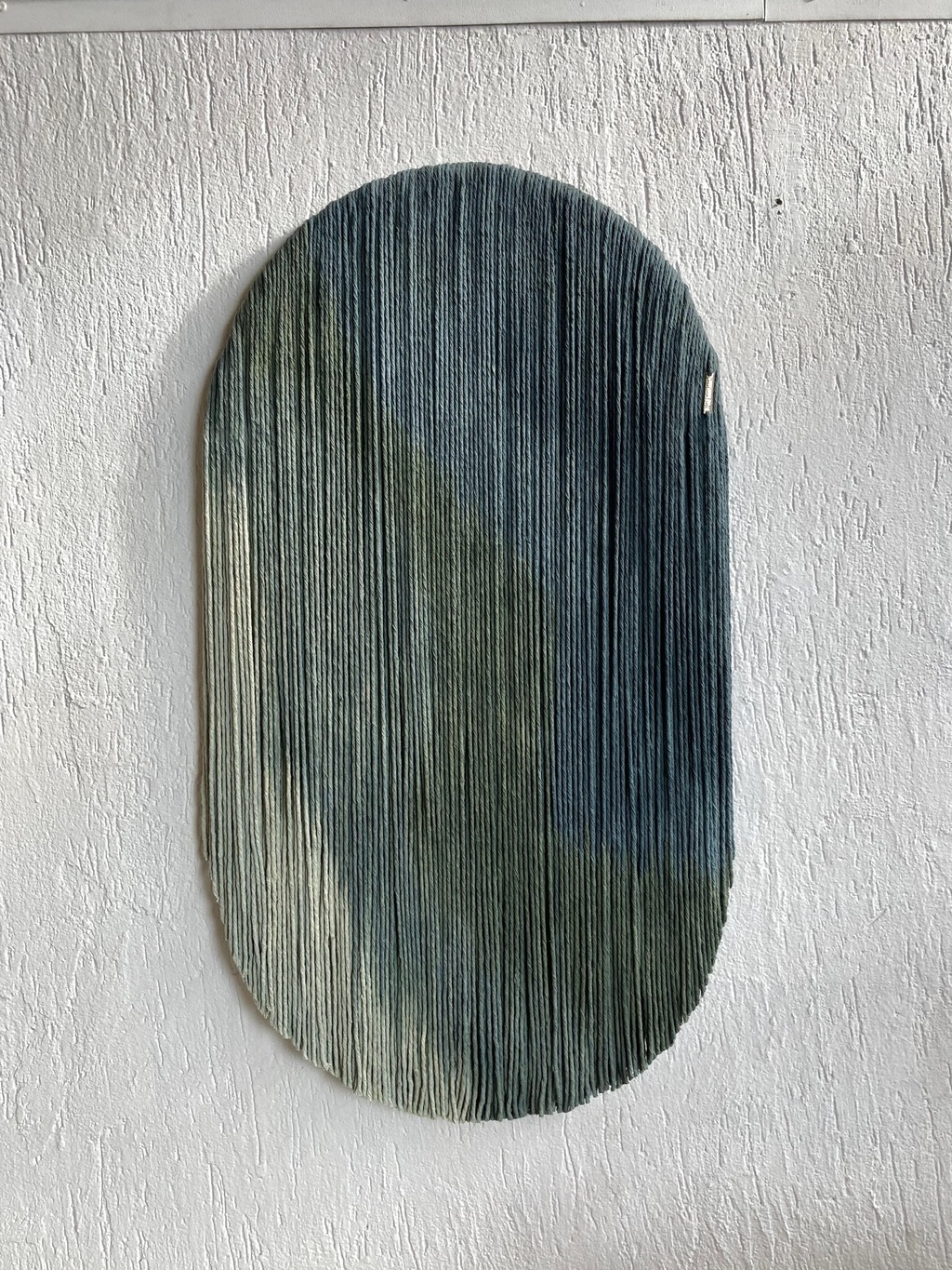 Tapeçaria de parede em fios espessos de algodão tingidos, sustentado por madeira.