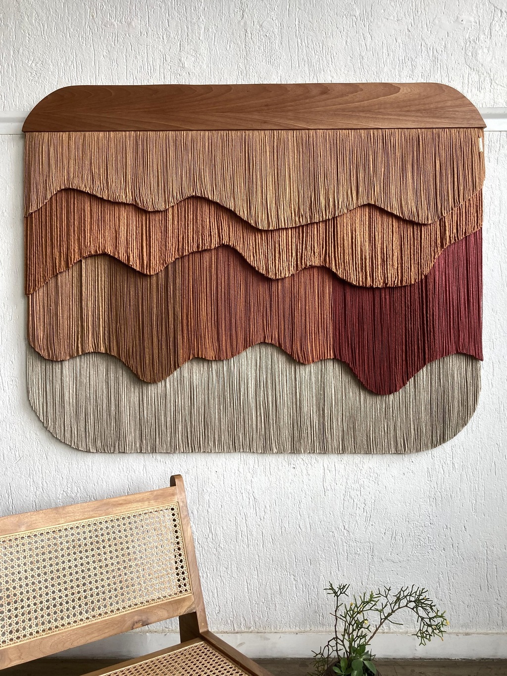 Tapeçarias de parede em fios finos e espessos de algodão tingidos, sustentado por semi-círculo alongado em madeira.