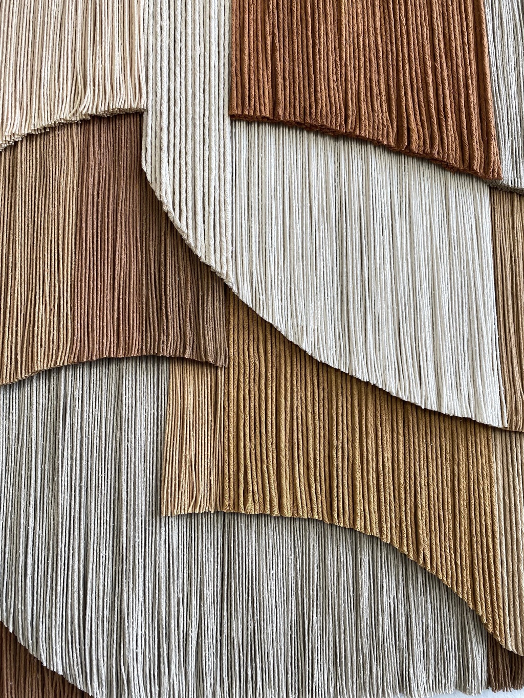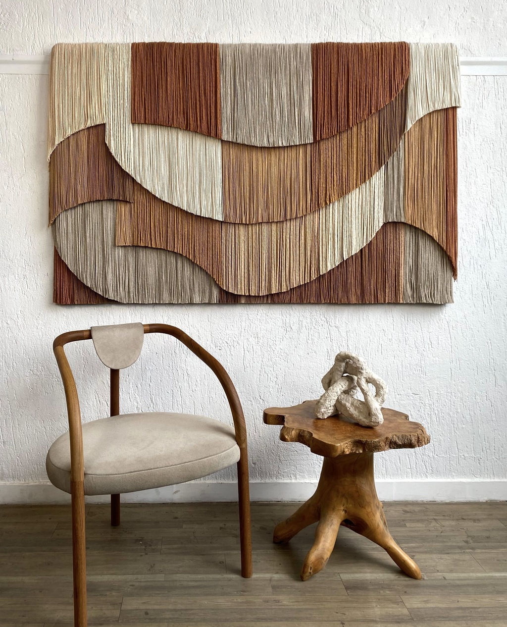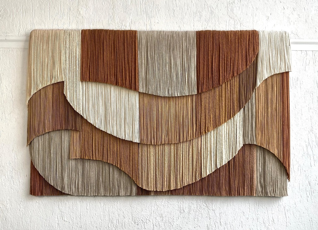 Tapeçaria de parede com sobreposições de camadas, em fios finos e espessos de algodão tingidos, sustentado por madeira.