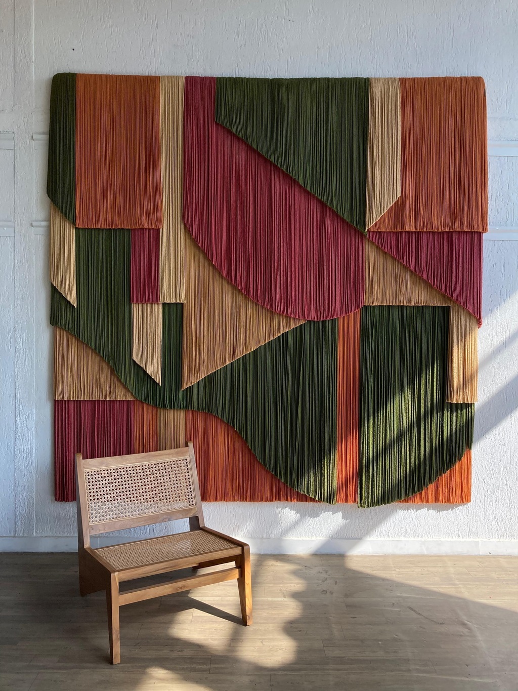 Tapeçaria de parede com sobreposições de camadas, em fios finos e espessos de algodão tingidos, sustentado por madeira.